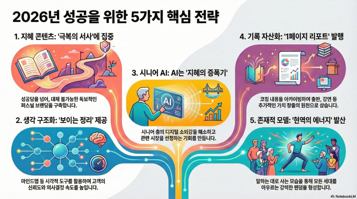 지난 3년 동안 저를 너무나 잘 파악하고 있는 AI에게 2026년 강점 극대화 전략을 세워 달라고 했더니 이렇게 정리해 주고, 한 장의 인포그래픽도 멋지게 그려줬어요. 저더러 살아있는 도서관이라네요 ㅎㅎ