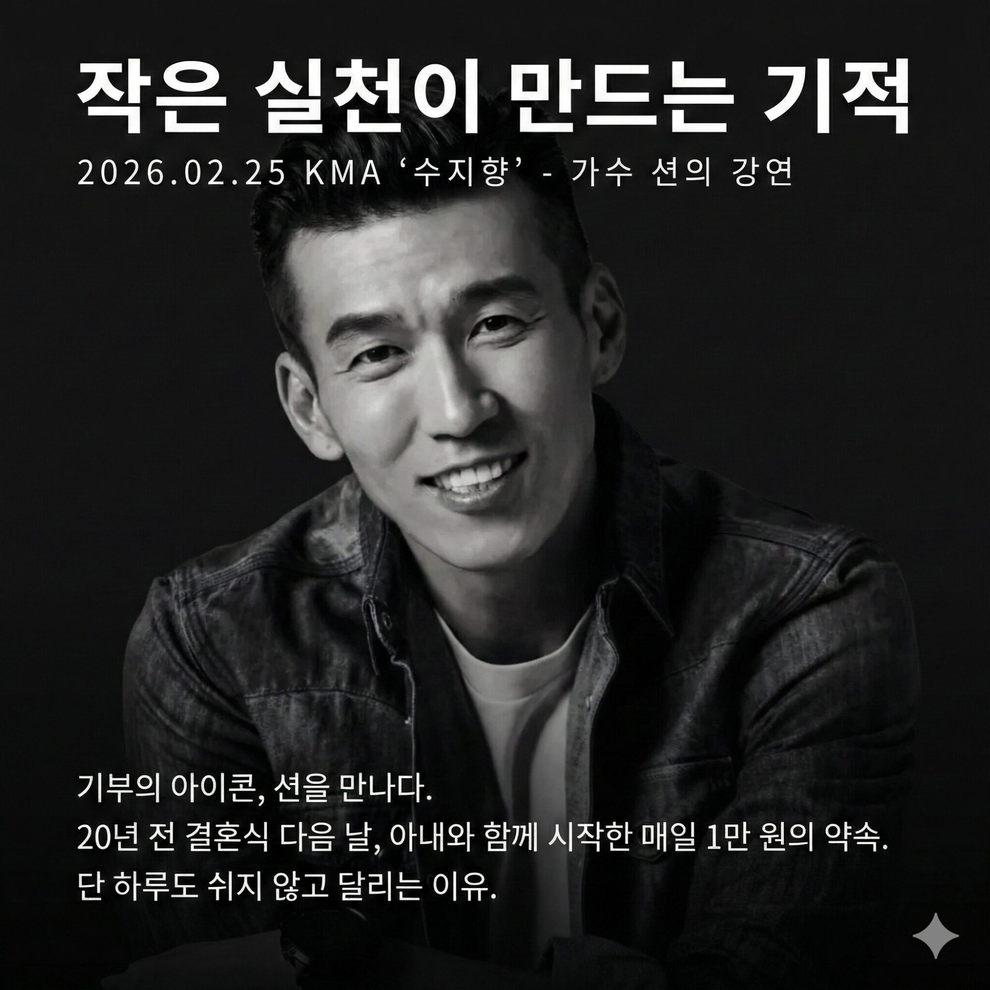 2026년 2월 25일 수요일, KMA 조찬 모임인 ‘수지향(수요일에 만나는 지혜의 향연)’에서 기부의 아이콘 가수 션을 만났습니다. 평소 그에 대한 이런저런 뉴스를 접해왔지만, 1시간 반 동안 직접 강연을 들으며 참으로 대단한 사람이라는 생각을 다시금 하게 되었습니다. 이날 그의 강연 주제는 ‘작은 실천이 바꾸는 기적의 힘 – 단 하루도 쉬지 않고 달리는 이유’였습니다.