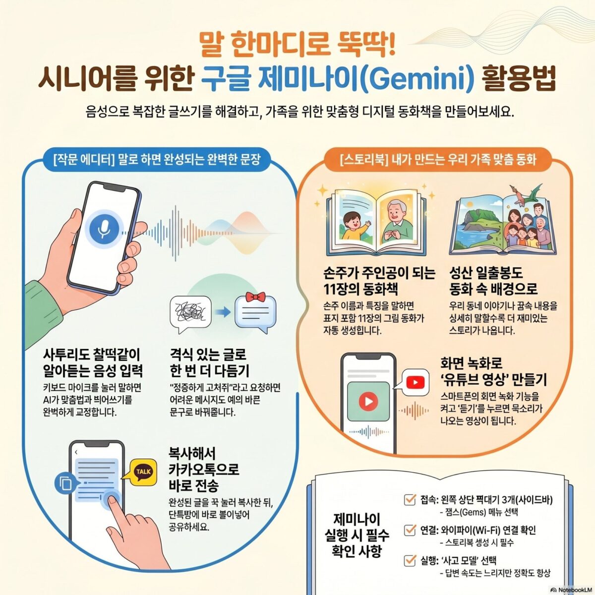 동화 만들기: 우리 손주를 위한 특별한 선물상상하는 이야기를 11장의 그림책으로 만들어줍니다.자세히 말하기: “성산일출봉에서 거북이가 달리기 시합하는 동화 써줘”처럼 장소와 내용을 구체적으로 알려줄수록 좋습니다. 손주 이름을 넣으면 더 좋아하겠죠?듣기 기능: 하단의 ‘듣기’ 버튼을 누르면 AI가 따뜻한 목소리로 읽어줍니다.공유: 상단의 공유 아이콘을 눌러 가족 단톡방에 바로 보내보세요.