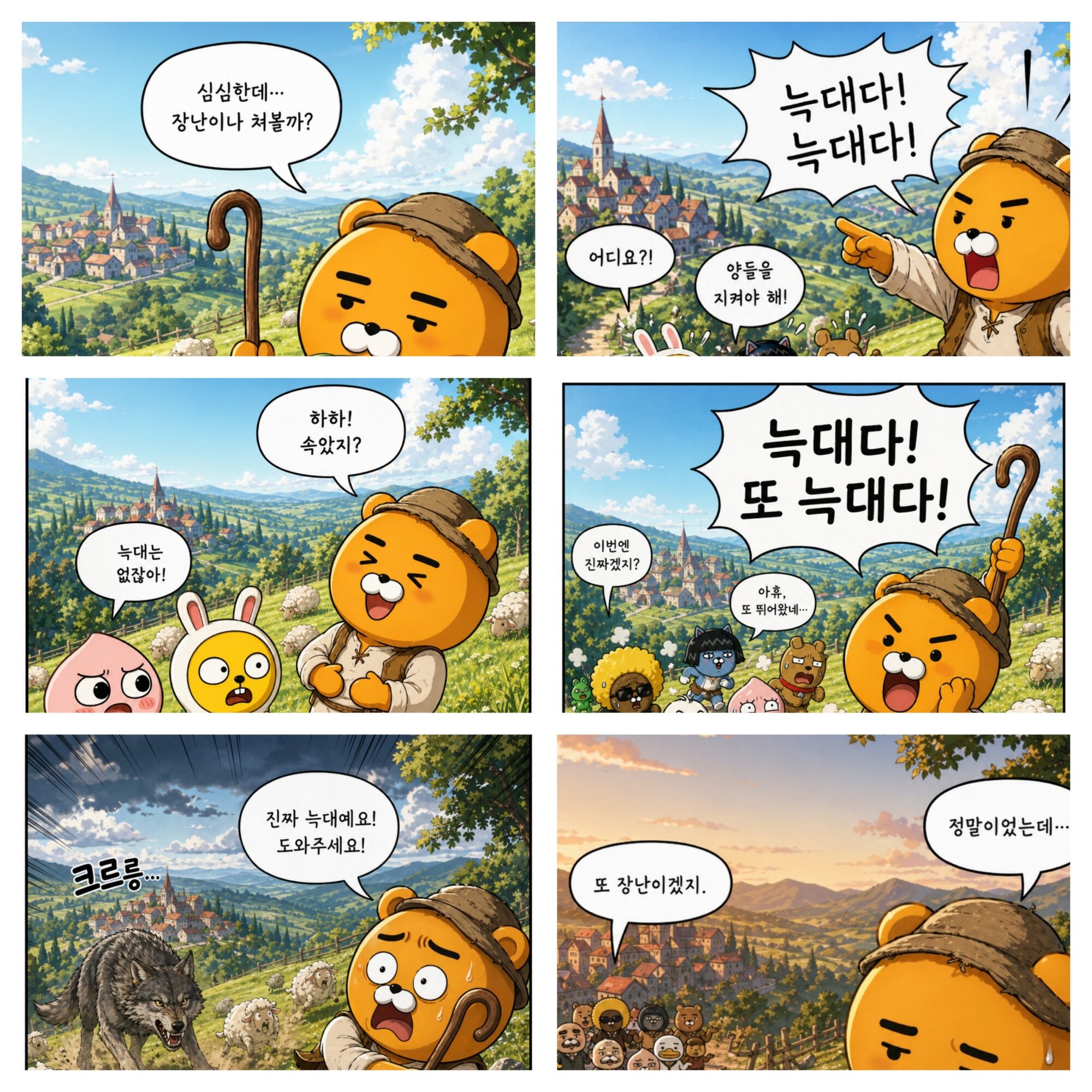 이솝우화에 나오는 양치기 목동을 카카오 프렌즈 캐릭터를 사용해 카툰으로 그렸습니다. 이것도 챗GPT 이미지 2로 그린 겁니다. 일단 한글 오타가 없어서 좋아요^^ Processed with MOLDIV 이전 글 [친구 만나기] 동두천을 가다