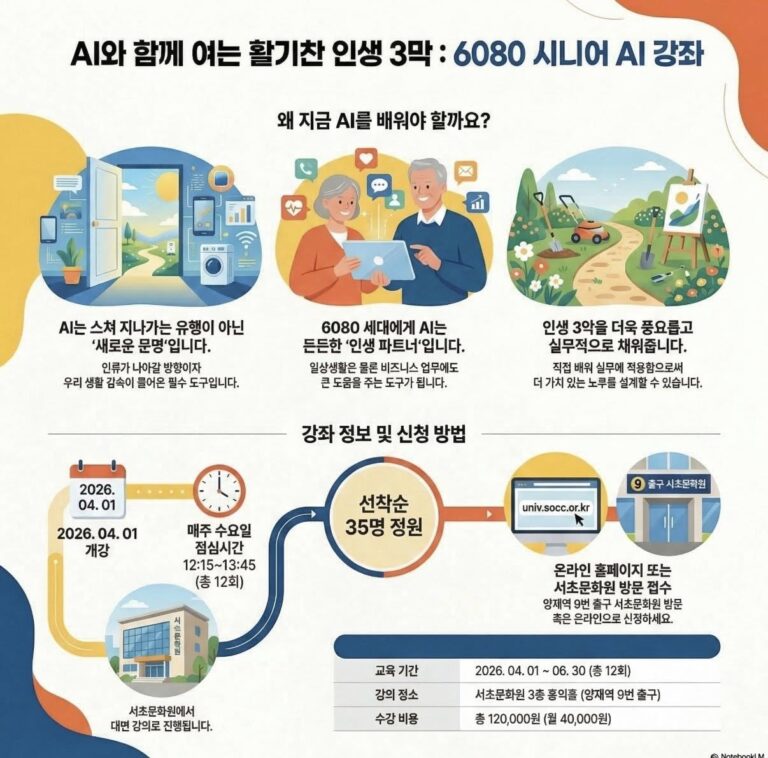 오늘날 AI는 우리 생활 속에 깊숙이 들어와 이제는 무시할 수 없는 존재가 되었습니다. 인생의 황혼기에 접어든 60대부터 80대 우리에게도, AI는 이미 일상과 비즈니스에서 큰 도움을…